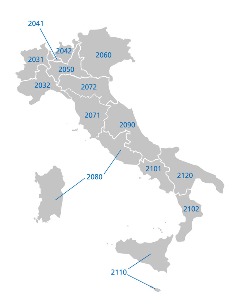 La mappa mostra la suddivisione dell’Italia nei Distretti del Rotary International, identificati dal relativo numero e disposti in base alla loro collocazione geografica.