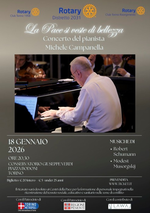 La Commissione Distrettuale per la Pace, con il supporto del Rotary Club Torino Risorgimento e del Rotary Club Torino 1958, organizza un Concerto per la Pace.